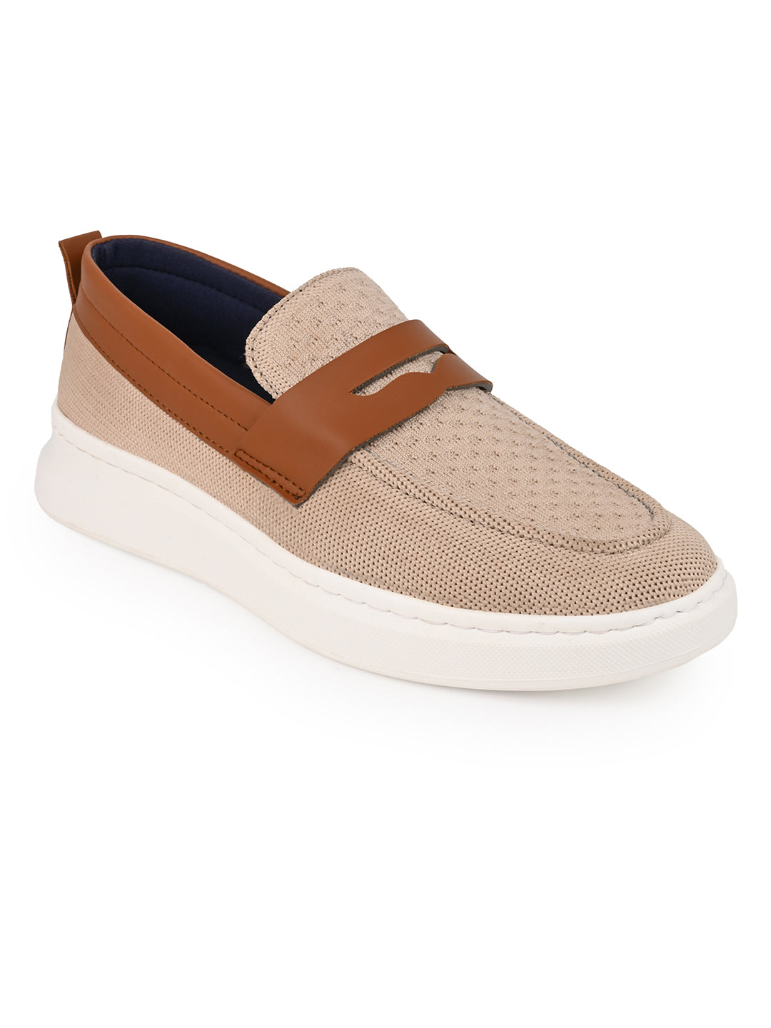 Step into effortless style with these slip-on loafers. Crafted with a breathable knit upper and a sleek synthetic strap, they offer a modern, sporty look without compromising comfort. The lightweight white sole ensures all-day ease, making them perfect for both casual and semi-formal wear.